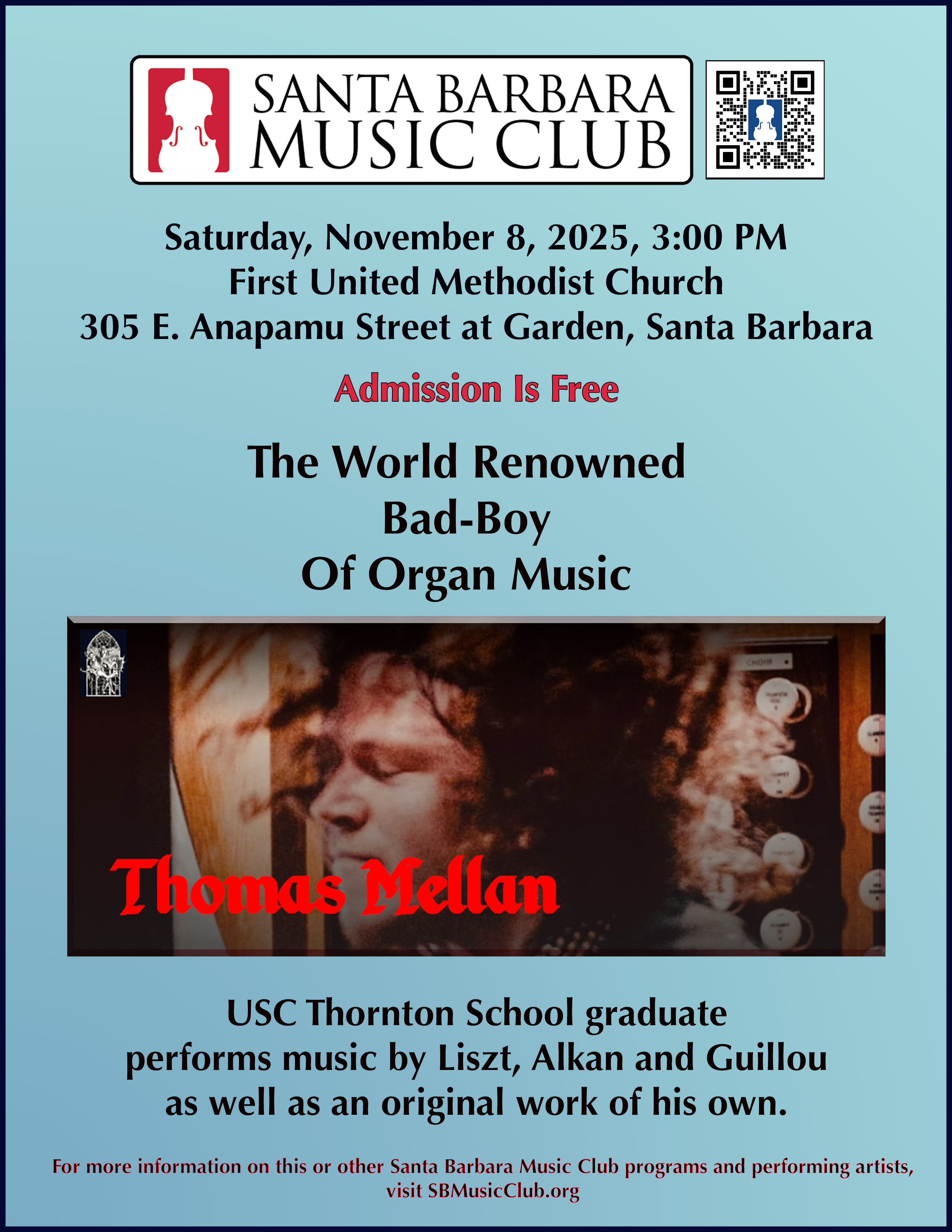 The Santa Barbara Music Club, in collaboration with the First United Methodist Church of Santa Barbara, presents another program of great organ music on Saturday, November 8, at 3:00 PM, at the First United Methodist Church, 305 E. Anapamu Street, Santa Barbara. The University of Southern California Thornton School Wunderkind graduate Thomas Mellan performs works by Charles-Valentin Alkan, Frédéric Chopin, Franz Liszt, Jean Guillou, and a recent work of his own.