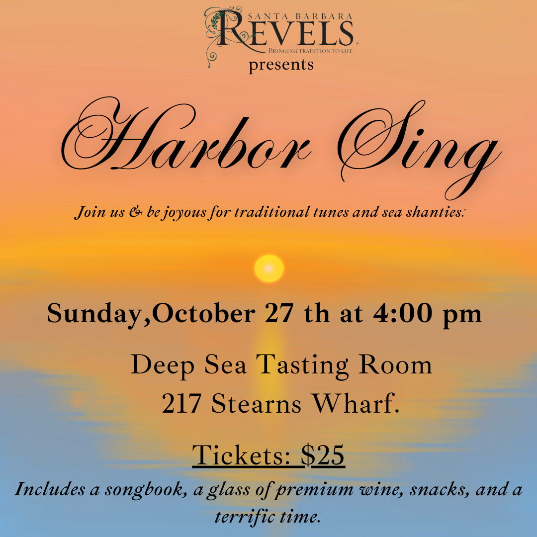 Anticipate music and merriment with Santa Barbara Revels and our Harbor Sing! Returning by popular demand, this year’s event takes place on Sunday, October 27th at 4:00 pm at Deep Sea Tasting Room, 217 Stearns Wharf. In the tradition of Revels’ popular Pub Sings, at which anyone and everyone is invited to join in some rollicking music-making, our Harbor Sing is designed for singing, clapping, and laughing, as we highlight traditional tunes and sea shanties, plus everyone’s Irish favorites, in anticipation of this year’s The Christmas Revels: A Winter Solstice Celebration – “The Ghosts of Haddon Hall.” The festivities are under the able and enthusiastic direction of Revels Music Director Dauri Kennedy.