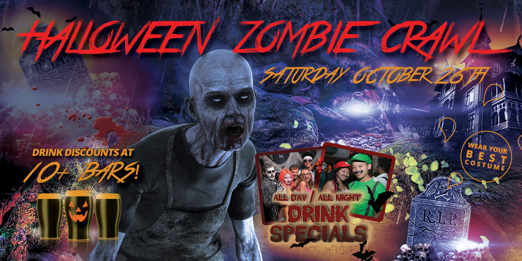 💀 Join over 300+ guests on our annual Zombie Crawl Halloween bar crawl! Come in costume and roam the lively State St stopping in and out of over 10+ bars and nightclubs with one all-access pass 💀
