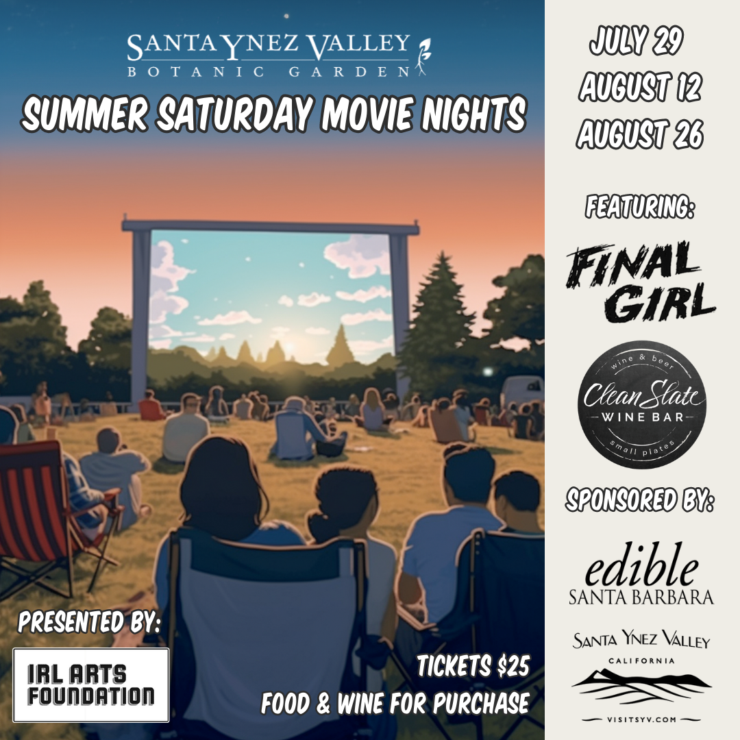 The Santa Ynez Valley Botanic Garden and the IRL Arts Foundation are delighted to announce their collaborative event series, “Summer Saturday Movie Nights.” Join us July 29, August 12, and August 26 for an extraordinary cinematic experience.