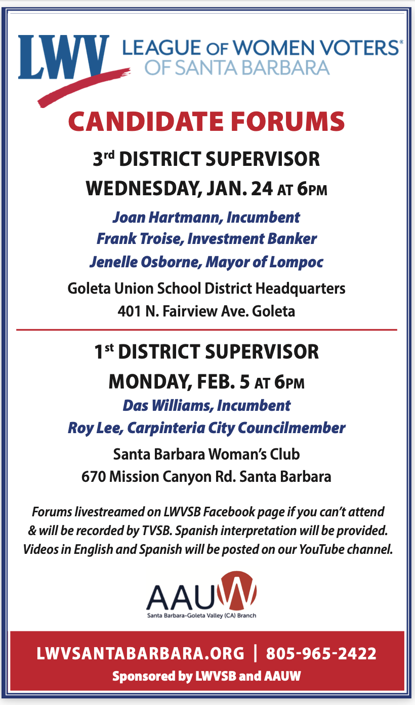 The League of Women Voters of Santa Barbara (LWVSB) is hosting candidate forums for Third District and First District Supervisor seats for the Santa Barbara County Board of Supervisors.