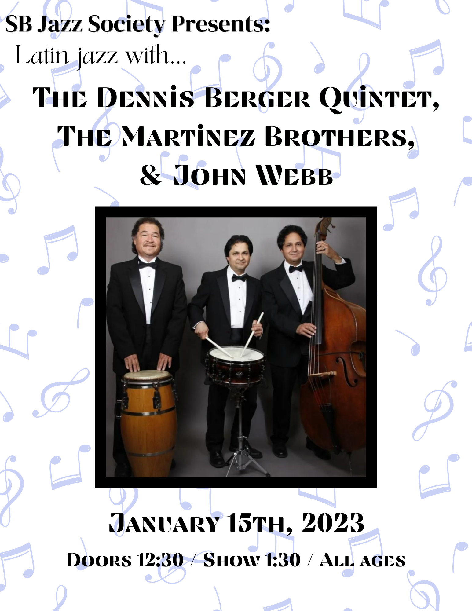 “Many of you have asking when we were going to feature Latin Jazz….Well, that time has arrived! On Sunday, January 15, we are presenting the Dennis Berger Quintet with the Martinez Bros and John Webb. Both John and Dennis are fine pianists as well as top saxophone players and plan to double on both. Ruben Martinez plays bass and flute with brothers, Lorenzo on percussion and Rene on drums. If you like bossas, mambos and more, you’ll want to be there. We can promise that it will be an exciting afternoon of Latin Jazz.”