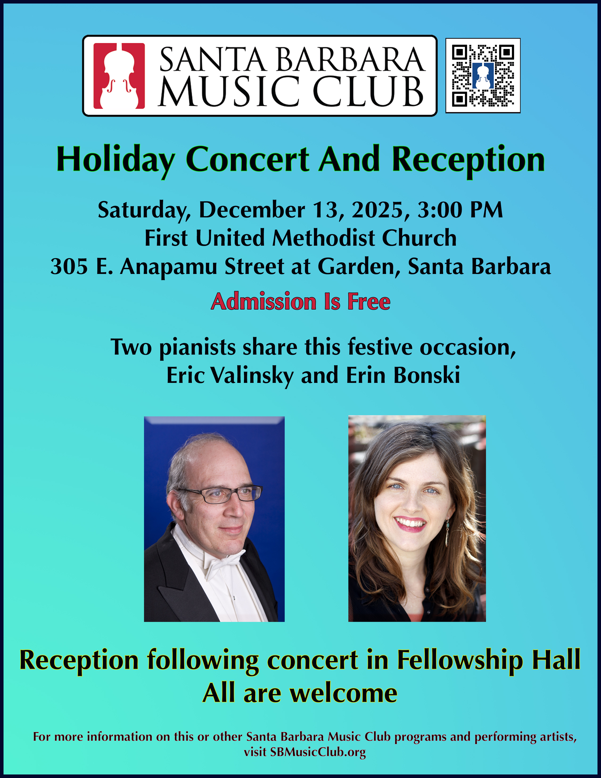 On Saturday, December 13, at 3:00 PM, the Santa Barbara Music Club will present its annual Holiday Concert and Reception with a festive program of solo piano works by Ottorino Respighi, Wolfgang Amadeus Mozart, Yannis Constantinidis, Manos Hadjidakis and Mikis Thedorakis performed by Erin Bonski and Eric Valinsky. The concert will be held at First United Methodist Church, 305 E. Anapamu St., Santa Barbara. Visit <SBMusicClub.org> for concert notes and program details. Admission is free.