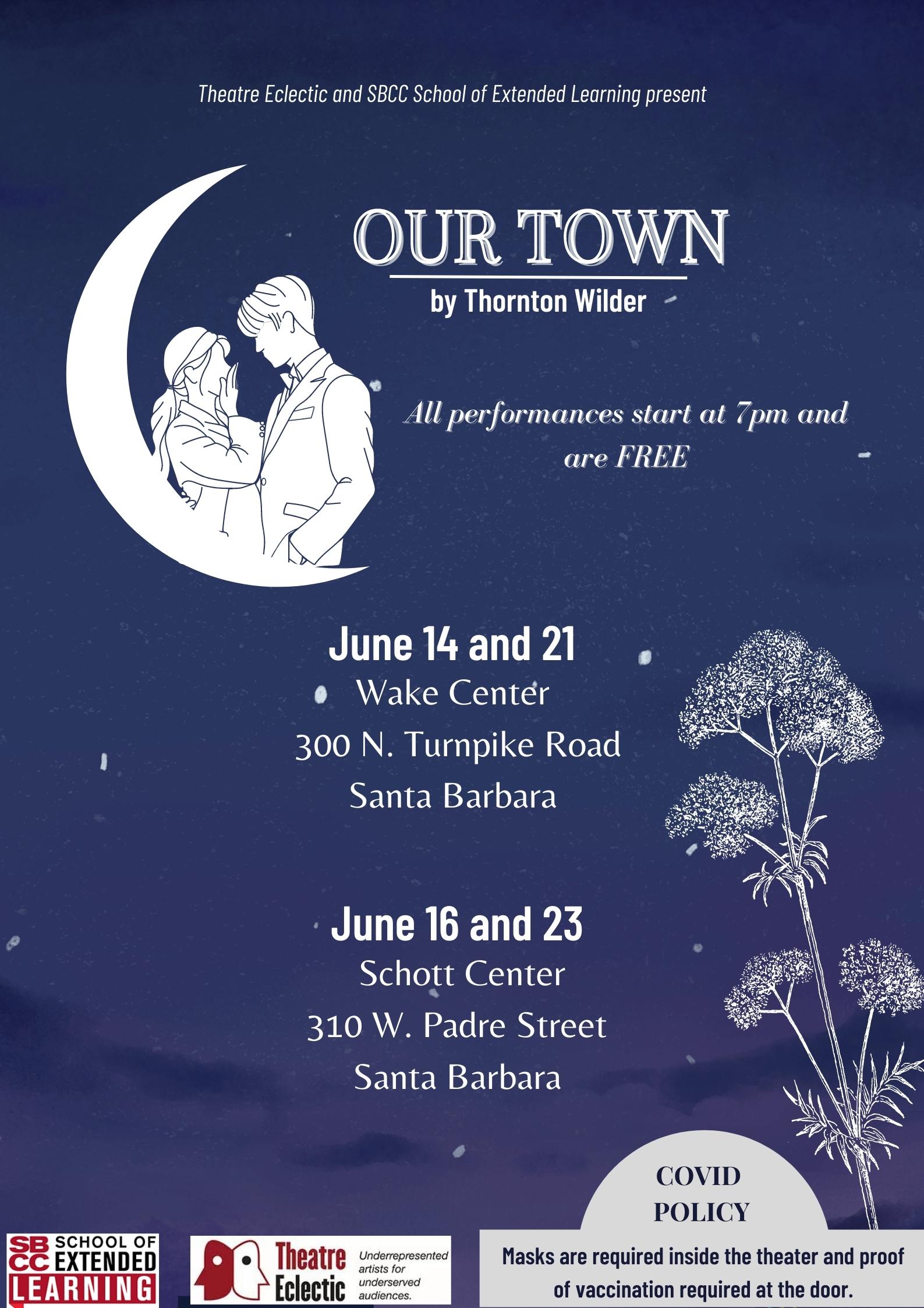 They present the three-act play, Our Town, for four free performances on June 14 & 21 at SBCC Wake Center, 300 N. Turnpike Road, and June 16 and 21 at SBCC Schott Center, 310 W. Padre St. All performances start at 7:00 pm – doors open at 6:45 pm. The shows will follow SBCC Covid Protocols: Masks are required indoors and proof of vaccination is required at the door.