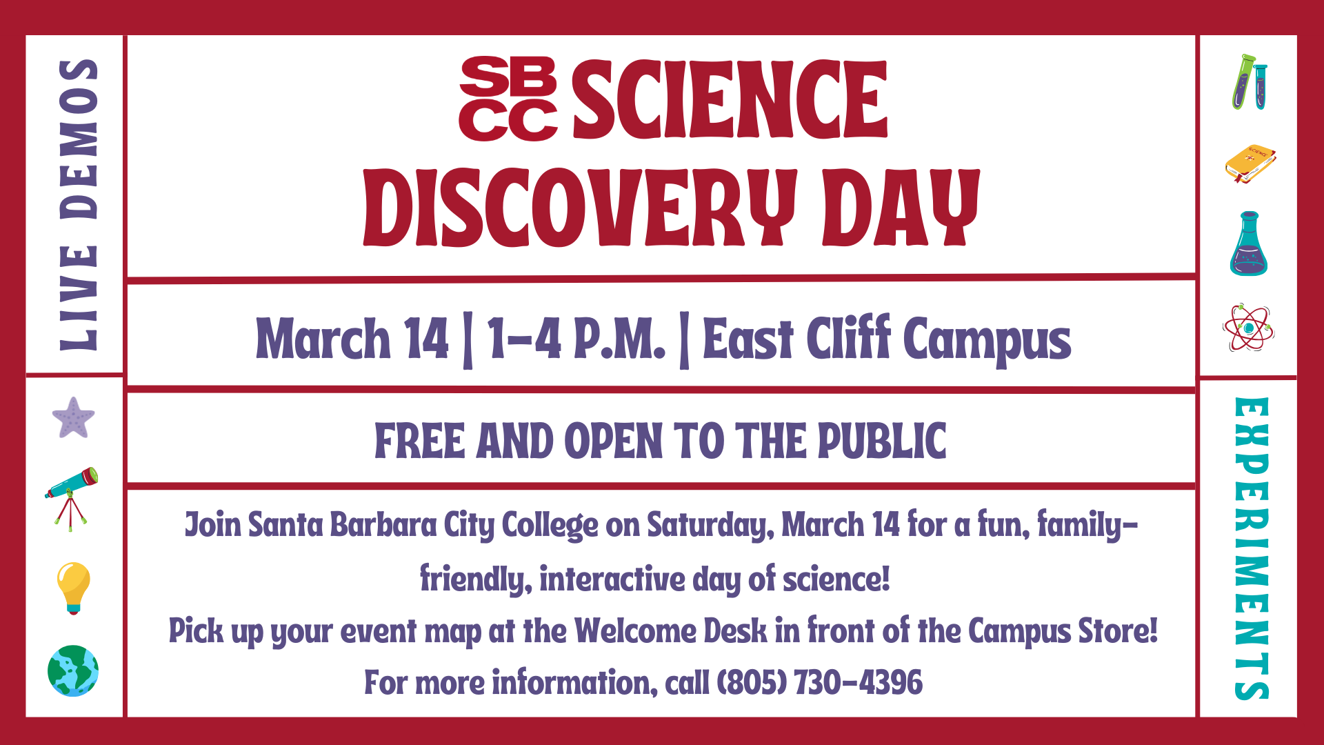 Presented by the SBCC STEM (Science, Technology, Engineering and Math) Transfer Program, Science Discovery Day is a FREE family event, created by SBCC students and faculty to showcase the wonders of the world, with interactive displays and hands-on activities for the whole family.By “hands on,” organizers mean things like: