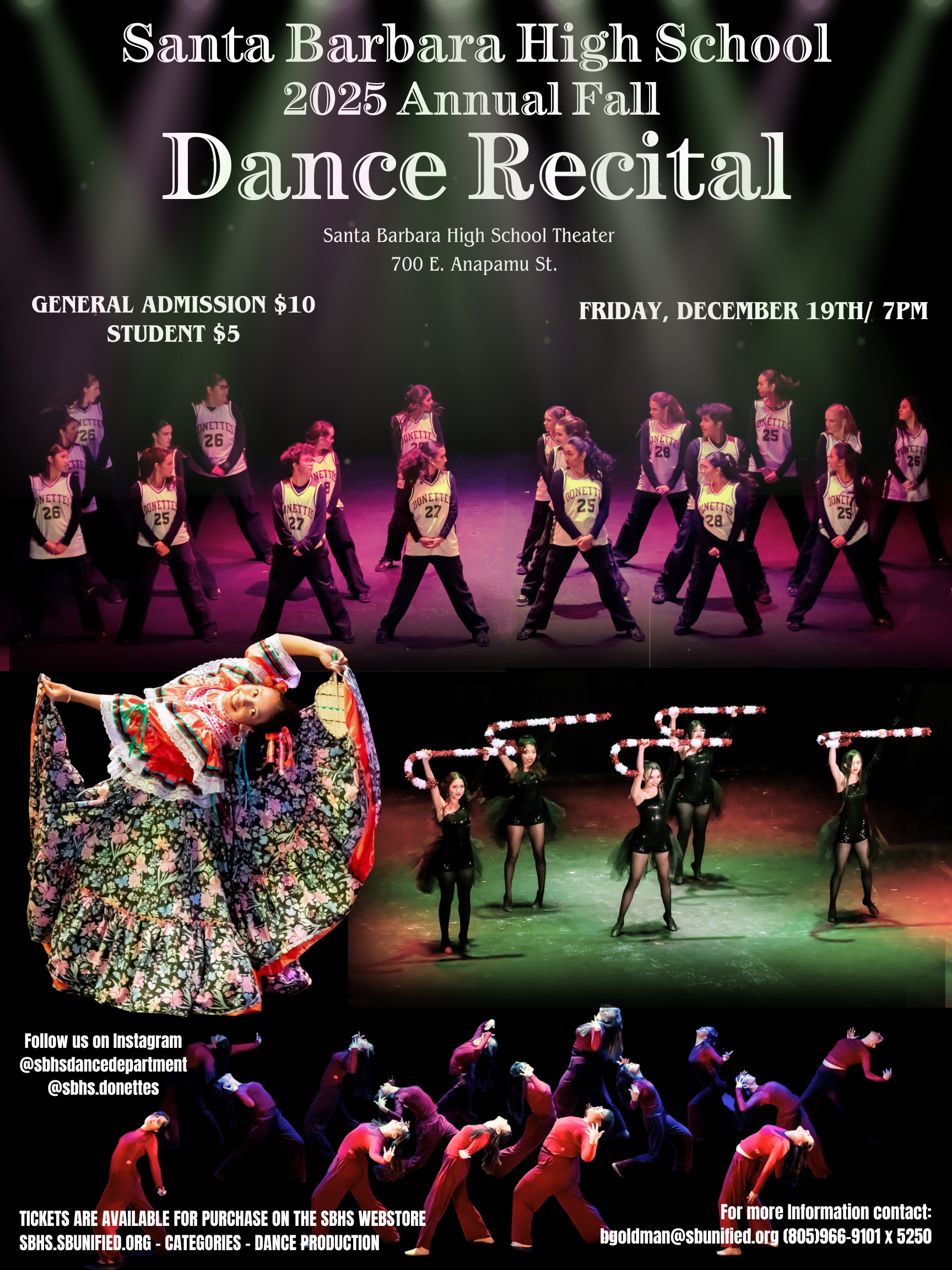 Santa Barbara High School Dance Program warmly invites you to our Annual 2025 Fall Dance Recital on Friday, December 19 at 7:00 pm in the SBHS Theater!