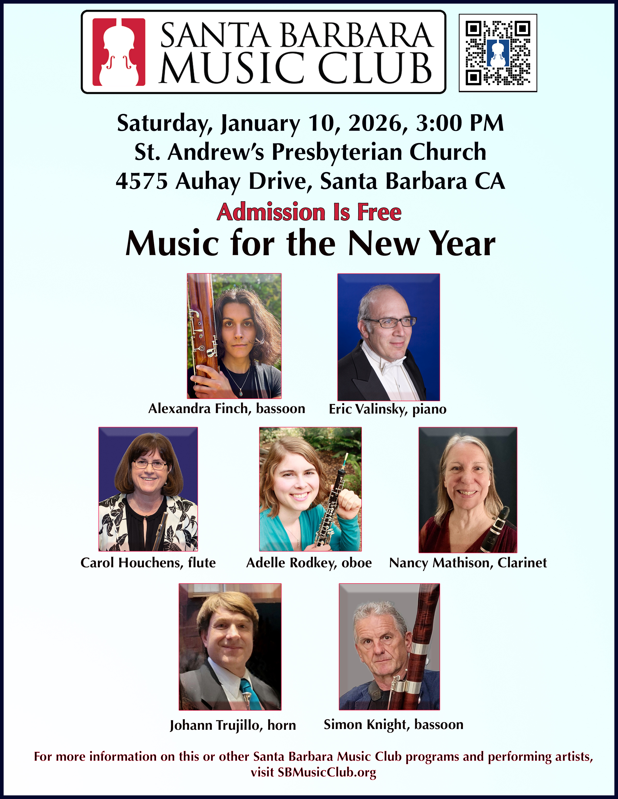 The Santa Barbara Music Club celebrates its fifty-sixth season of serving the greater Santa Barbara community with free monthly concerts, Saturdays at 3:00. Our concert, MUSIC FOR THE NEW YEAR, will be performed on January 10 at 3:00 at St. Andrew’s Presbyterian Church, 4575 Auhay Drive, Santa Barbara and will feature the world premiere of Sonata for Bassoon and Piano by Santa Barbara Music Club’s past president Eric Valinsky played by Alexandra Finch and the composer. Also on the program are Lucas Richman’s Concerto for Oboe: the Clearing played by Adelle Rodkey and Eric Valinsky, and Carl Nielsen’s Quintet Opus 43, played by Carol Houchens, Adelle Rodkey, Nancy Mathison, Johann Trujillo, and Simon Knight, known as the Santa Barbara Chamber Players Woodwind Quintet. Admission is Free.