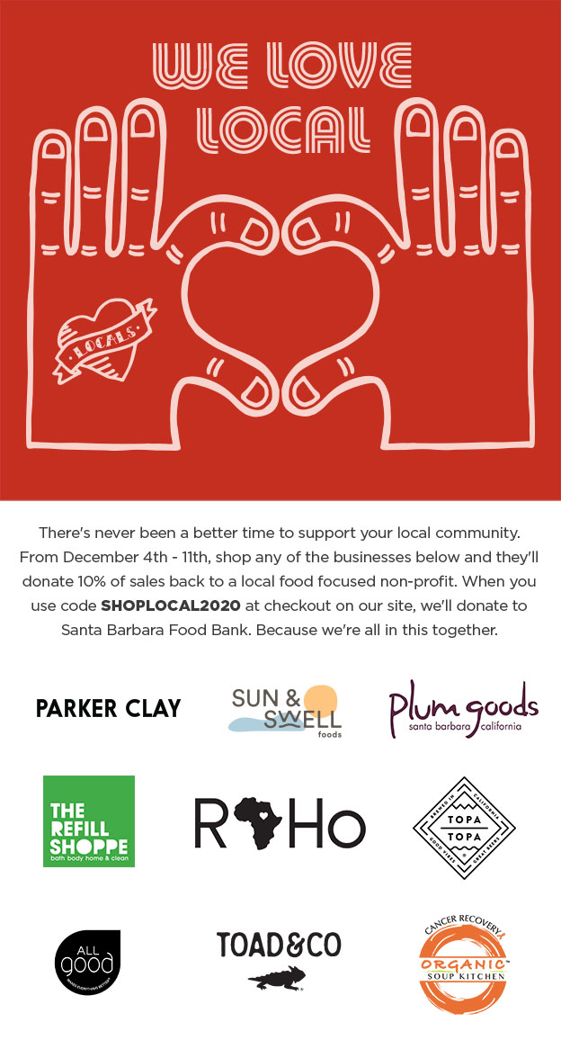Use code SHOPLOCAL2020 at checkout and to give back to The Food Bank! We are all in this together!