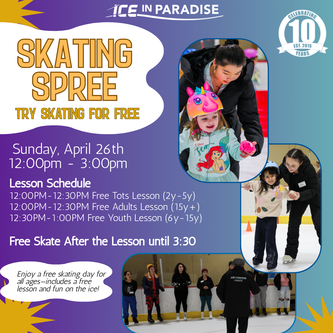 Skating Spree: Try Skating for Free takes place Sunday, April 26 from 12:00–3:00pm.