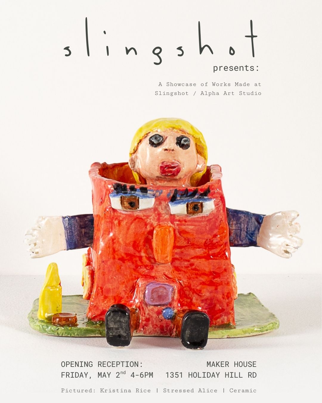 Goleta, CA – Maker House / Clay Studio is proud to host Slingshot Presents, an inspiring exhibition of hand-built ceramics created by six visionary artists from Slingshot / Alpha Art Studio—a progressive Santa Barbara-based art center supporting the professional creative practices of adults with intellectual and developmental disabilities (IDD).