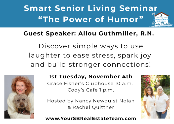 Join Nancy Newquist Nolan and Rachel Quittner of Your SB Team as Special guest Allou Guthmiller, R.N. presents an uplifting, interactive program on the healing power of humor. Discover simple ways to use laughter to ease stress, spark joy, and build stronger connections—all while having fun together!