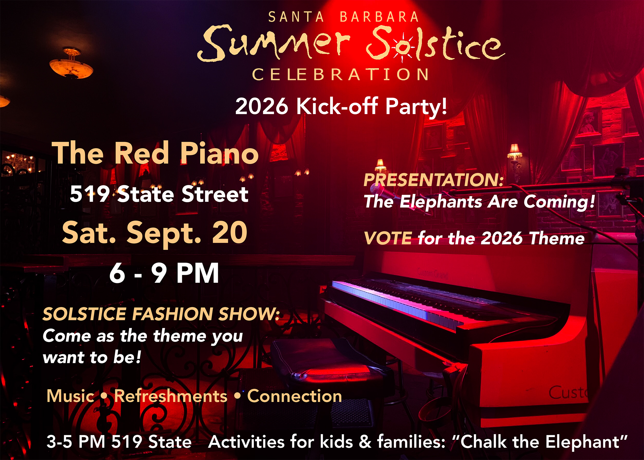 Celebrate the launch of the Mini-Elephant Parade® at this year’s Elephant Equinox Party at the Red Piano 6-9 PM! Summer Solstice Celebration Executive Director Penny Little will present “Let’s Paint a Brighter Future” at 7 PM, a preview of the Elephant Parade initiative, followed by live music from Crispin Barrymore & Friends. Submit your theme idea for the 2026 Parade by marking it in chalk or marker on a life-sized baby elephant sculpture! Come as the theme you want to be!
