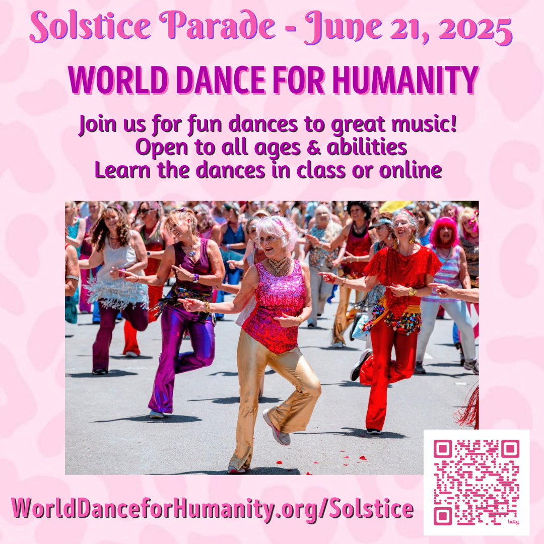Have you ever wanted to be in the Solstice Parade? Now’s your chance! Join World Dance for Humanity for a joyous celebration of community, creativity, and connection! Fun dances to great music, all ages and abilities are welcome!