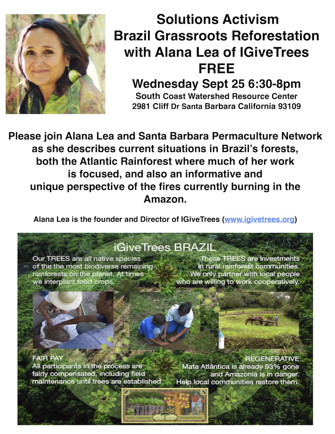Alana Lea is the founder and Director of IGiveTrees (www.igivetrees.org) , a nonprofit involved in reforestation projects in the Atlantic Rainforest of Brazil, which has been reduced by 90% by slash and burns agriculture and cattle ranching. There is an urgent need to restore the regional aquifers by replanting the forest through Agroforestry.