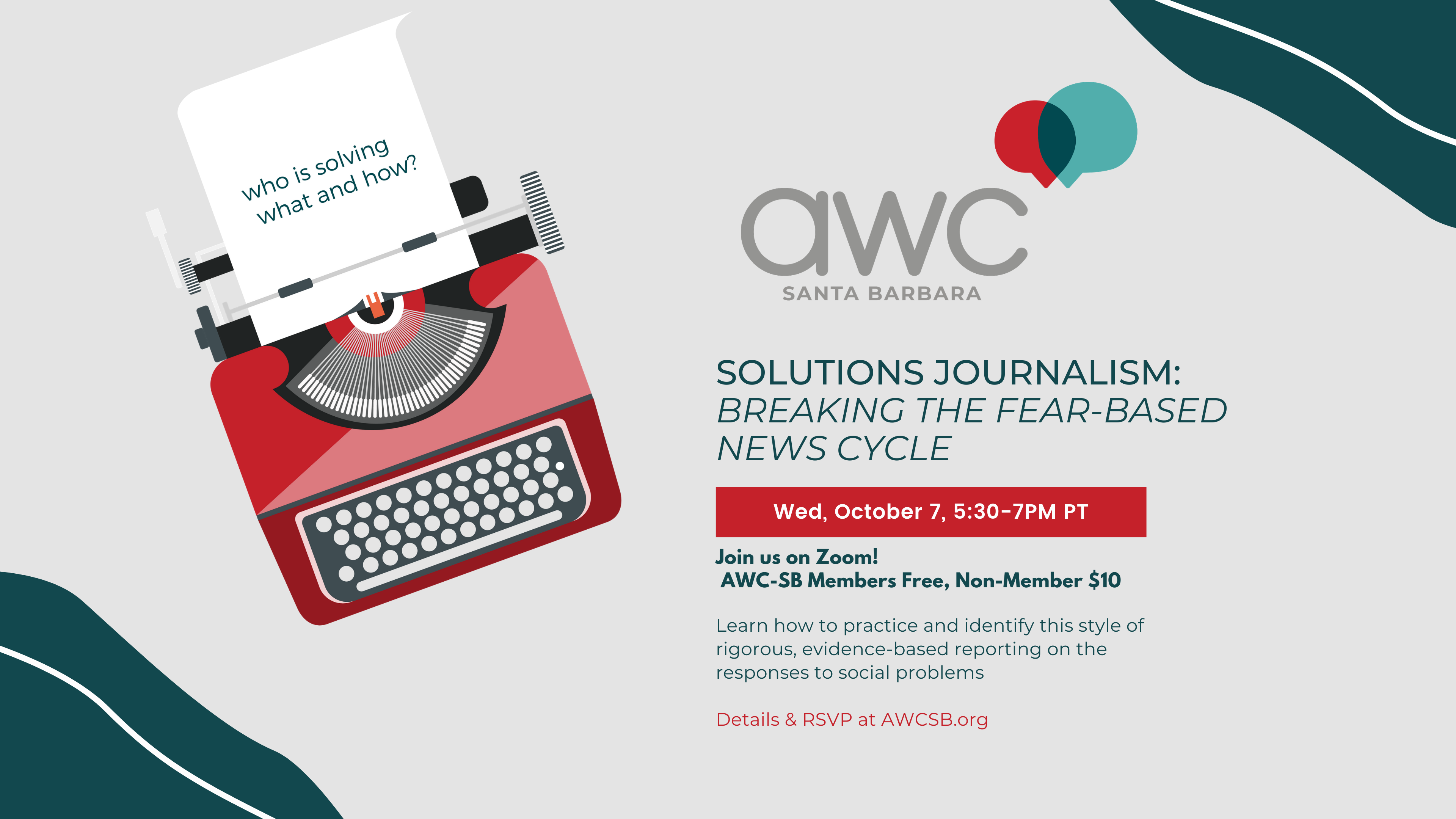 Presenters: Giana Magnoli, managing editor at Noozhawk, and Michelle Faust Raghavan, from Solutions Journalism Network will offer specific guidelines for how to identify stories and present them from a solutions journalism perspective. Join us on October 7th at 5:30PM to explore Solutions Journalism and how you can craft your stories in a way that drives positive social change.