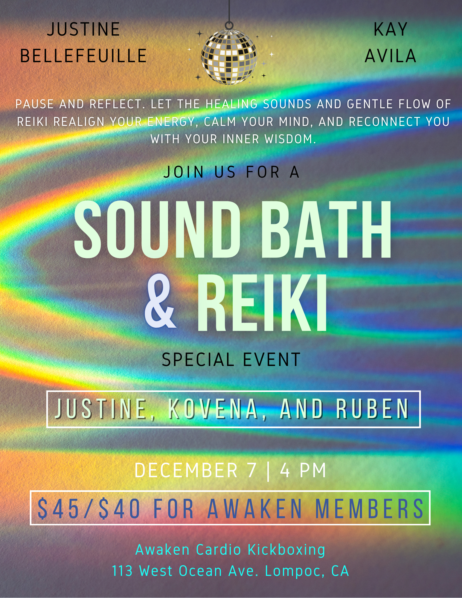 Join Justine from Goodland Chiropractic and Kay Avila for a 75-minute Reiki Sound Bath designed to guide you into a space of reflection, fresh perspectives, and renewed optimism. Held at Arise Kickboxing Studio in Lompoc, this immersive experience blends the gentle power of Reiki energy with healing sound vibrations to help release stagnant energy, foster insight, and encourage personal growth.