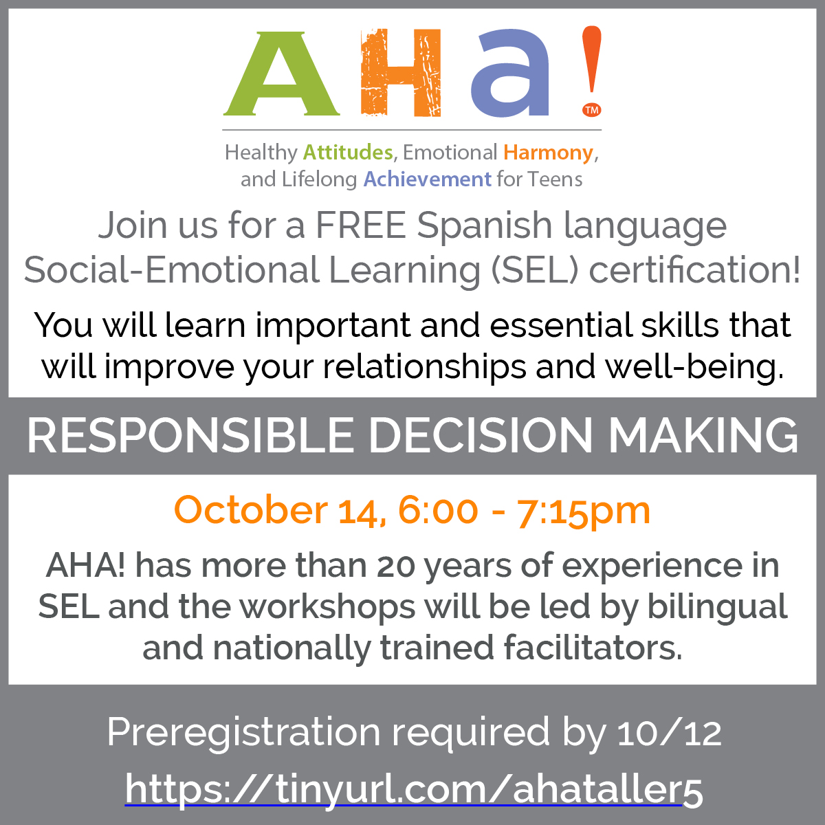 Acompañanos para obtener tu propia certificación. del Aprendizaje Socio-Emocional (SEL) impartido por AHA! Aprenderás habilidades importantes y esenciales para mejorar tus relaciones y bienestar.AHA! Cuenta con más de 20 años de experiencia en SEL. Esta serie de certificaciones dará inicio pronto, y será dirigida por facilitadores bilingües entrenados a nivel nacional.BENEFICIOS DE SEL Mayor desempeño académico Mejores actitudes y relaciones interpersonales Reducción de estrés emocional.