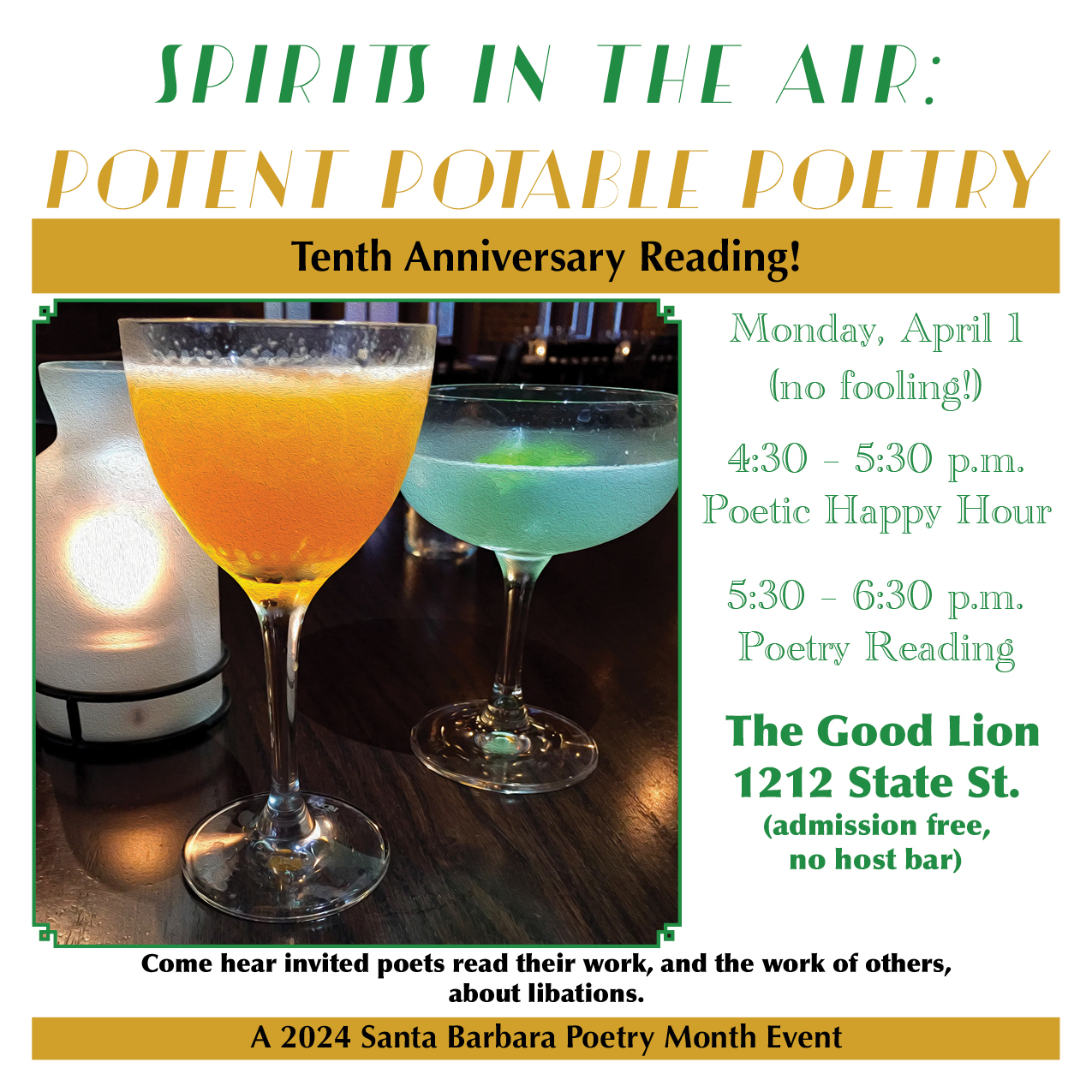 The reading “Spirits in the Air: Potent Potable Poetry” will be held Monday, April 1 at The Good Lion, 1212 State Street, Santa Barbara. There will be a poetic happy hour from 4:30 – 5:30 pm followed by the poetry reading itself from 5:30 – 6:30 pm. The event, which has free admission (and a no-host bar), is open to the public. It is the 10th anniversary of the reading (two years were held via Zoom because of Covid), and the special two-hour event is to honor that milestone. The Good Lion will also feature special poet-themed cocktails for the event.