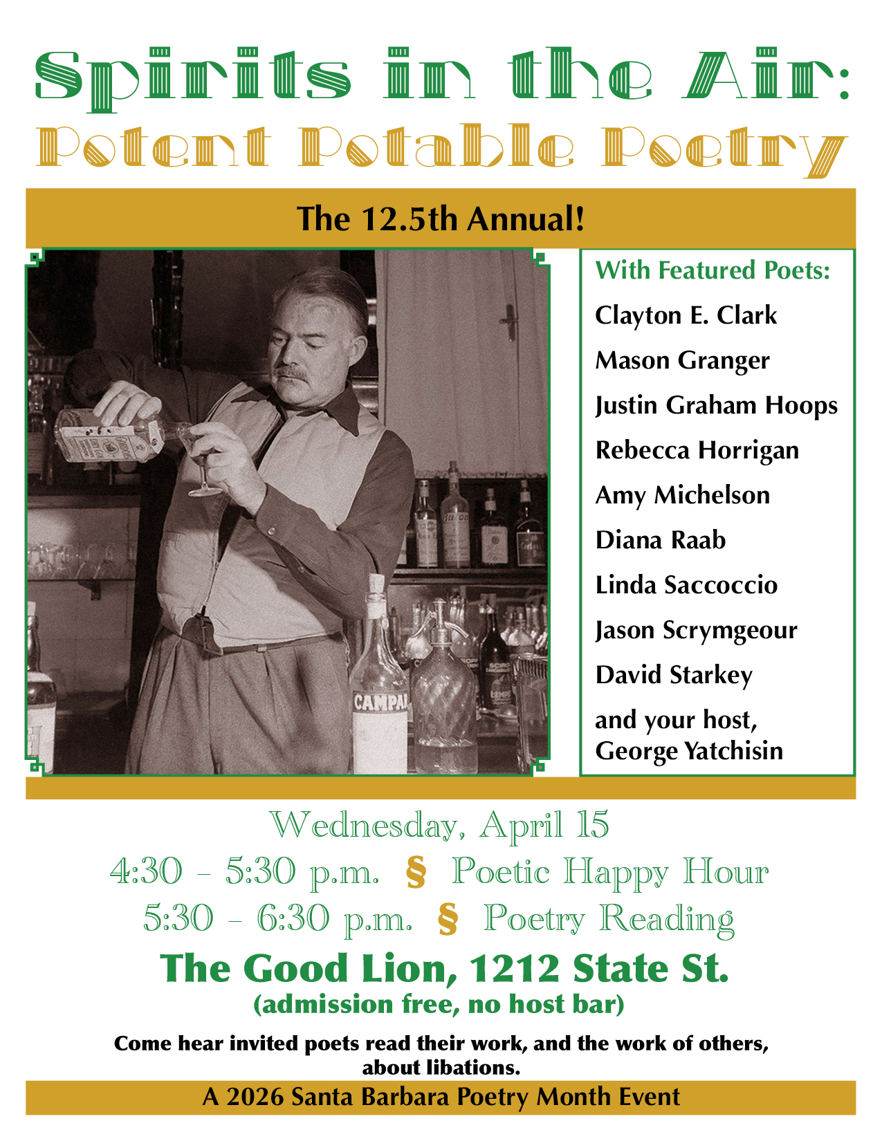 The reading “Spirits in the Air: Potent Potable Poetry” will be held Wednesday, April 15 at The Good Lion, 1212 State Street, Santa Barbara.