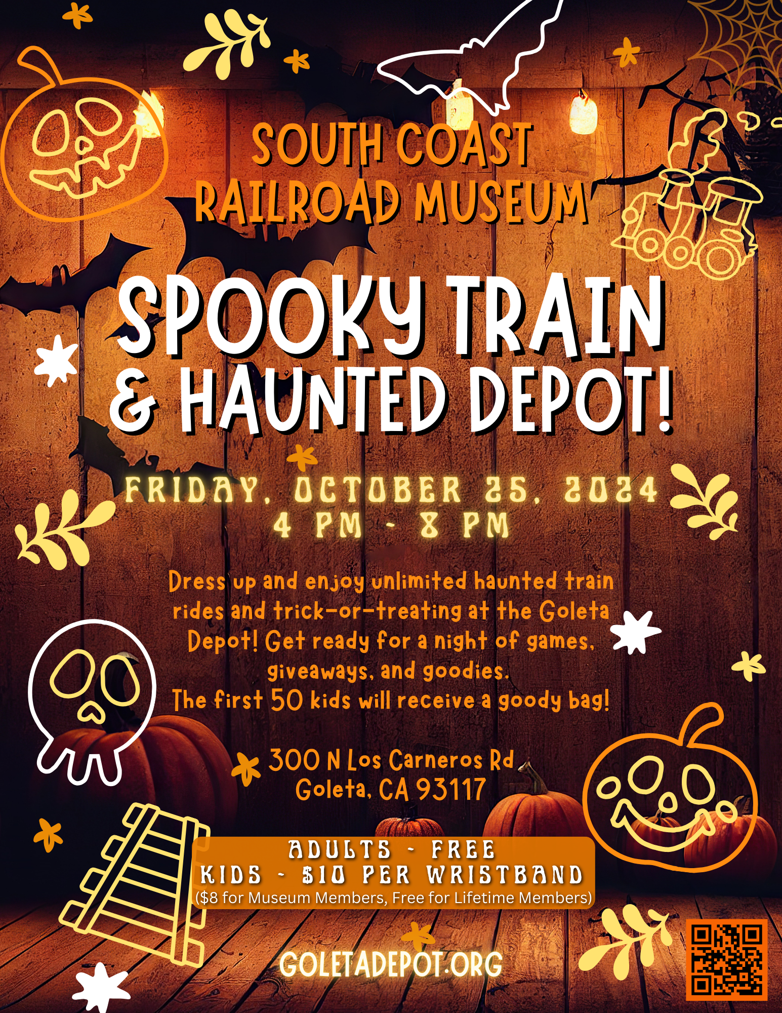 Get ready for a spooktacular night of family-friendly Halloween fun at the historic Goleta Depot! Climb aboard the Goleta Short Line, transformed with ghostly lights and decorations, and enjoy trick-or-treat stations, spooky storytime, and a haunted depot tour.