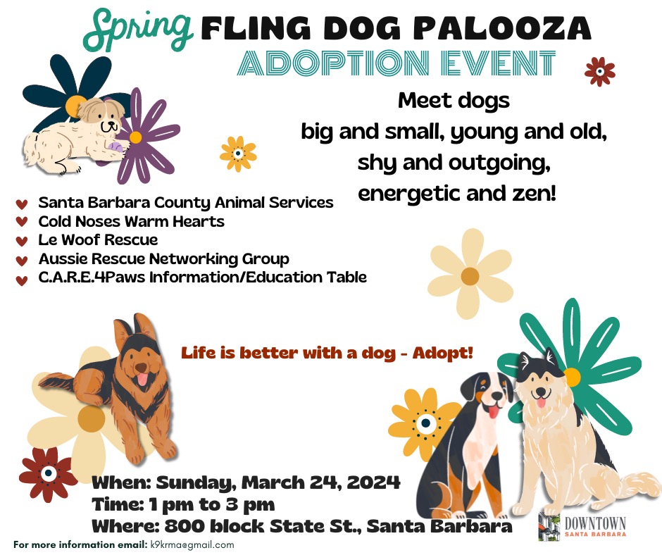 Due to the popularity and high attendance of dogs and people at the first dog adoption event on the State Street Promenade, adoptable dogs will be making a second appearance at the First State Street Spring Fling Dog Palooza. Several local animal rescue groups will have adoptable dogs and puppies on hand from 1-3pm on Saturday, March 24 in the 800 block of State St., ready to meet potential adopters and spread some doggy love to those in need!