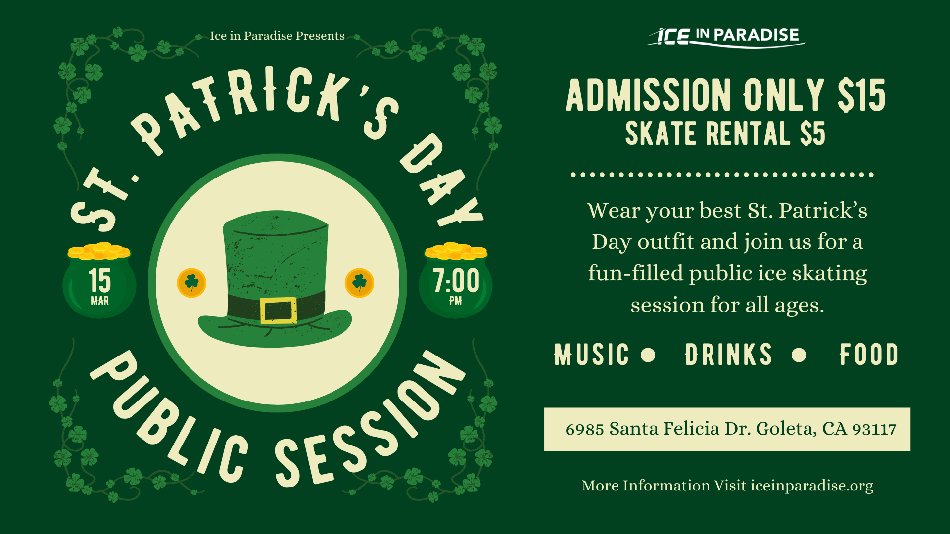 Ice in Paradise presents St. Patrick’s Day Public Session on Saturday, March 15, 2025, starting at 7PM. Wear your best St. Patrick’s Day outfit and join us! $15 admission, $5 skate rentals.