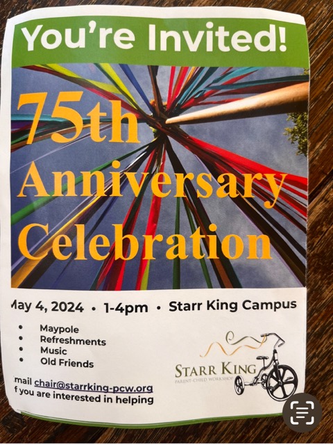 Starr King Parent-Child Workshop celebrates its 75th anniversary with live music, Maypole dance, cake and potluck. Come and reminisce with Starr King staff past and present,catch up with lifelong friends, and celebrate the gift of building community support via parent cooperation and play-based learning.