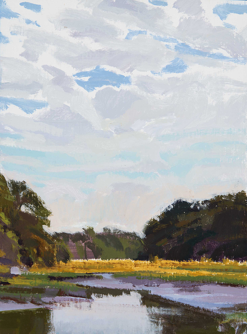 Lakes and ponds capture fallen foliage and colors of the sky, while a change in vantage point reveals a murky world of dark greens and browns. Smoothly blended brushstrokes and washes let us look into the watery deep. Retreating and overflowing creeks, rivers, and wetlands feed these momentary visions in oil or acrylic; short streaks and dabs of paint form the ripples and speckled colors of their dynamic surfaces. Thick and thin paint application accentuates textures of grasses and needs contrasting with smooth wet surfaces. Tactile pleasure in the mediums draw us close to the canvas and into these painted idylls.