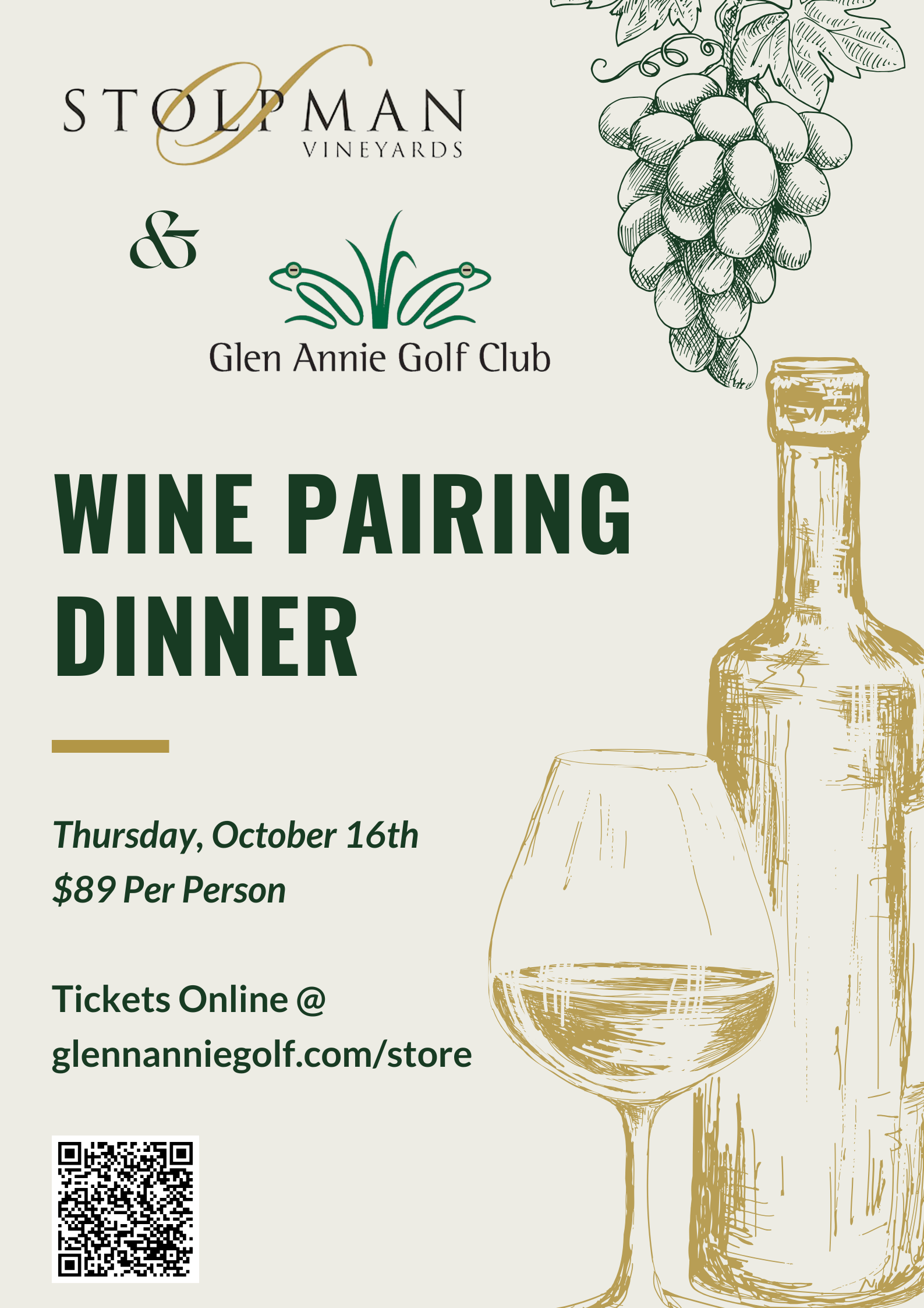 We are delighted to welcome Stolpman Vineyards for a spectacular evening of fine wine and elevated dining at Glen Annie Golf Club. Guests will savor a thoughtfully crafted multi-course menu, each dish paired perfectly with Stolpman’s bold and expressive wines. Known for their dedication to Rhône varietals and sustainable farming, Stolpman delivers distinctive flavors that shine with every pour.