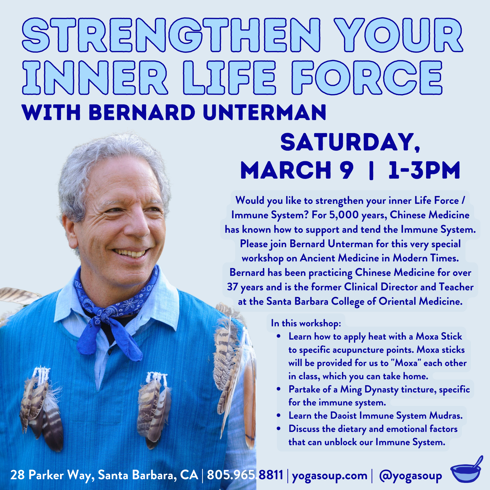 Would you like to strengthen your inner Life Force / Immune System? For 5,000 years,Chinese Medicine has known about the Immune System. Please join Bernard Unterman for this very special workshop on Ancient Medicine in Modern Times. Bernard has been practicing Chinese Medicine for over 37 years. He is the former Clinical Director and Teacher and the Santa Barbara College of Oriental Medicine, among other experience.