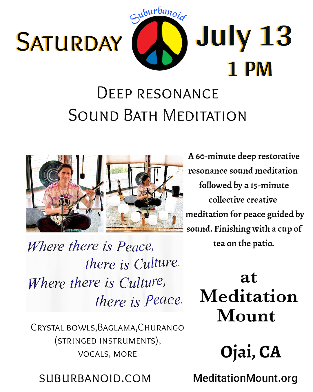 Also available is Suburbanoid’s Sunday morning sound meditation at Meditation Mount. Every Sunday!