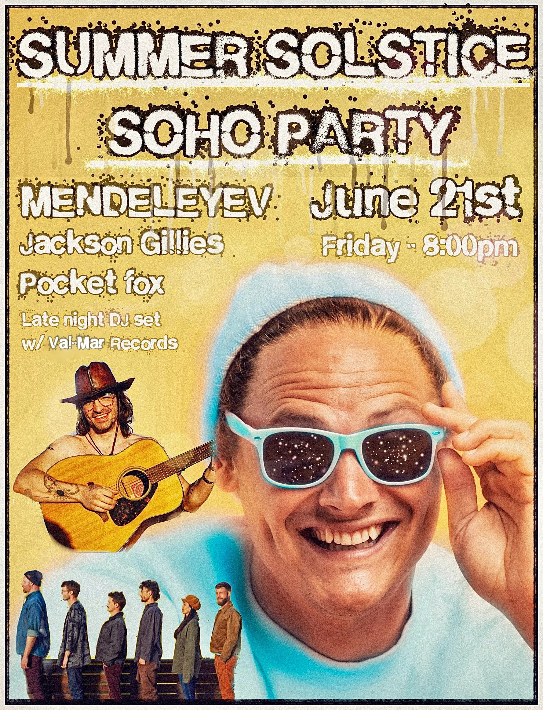 Celebrate the summer solstice at SOhO with Mendeleyev alongside Pocket Fox, Jackson Gillies plus Val-Mar Records!