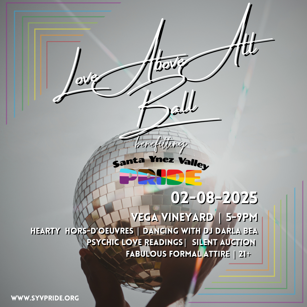 SYV Pride is proud to host its second annual Love Above All Ball at Vega Vineyard & Farm in Buellton, CA. This is an incredible benefit gala that supports SYV Pride’s mission to create a safe, supportive, and empowering home for the LGBTQ+ community in the Santa Ynez Valley.