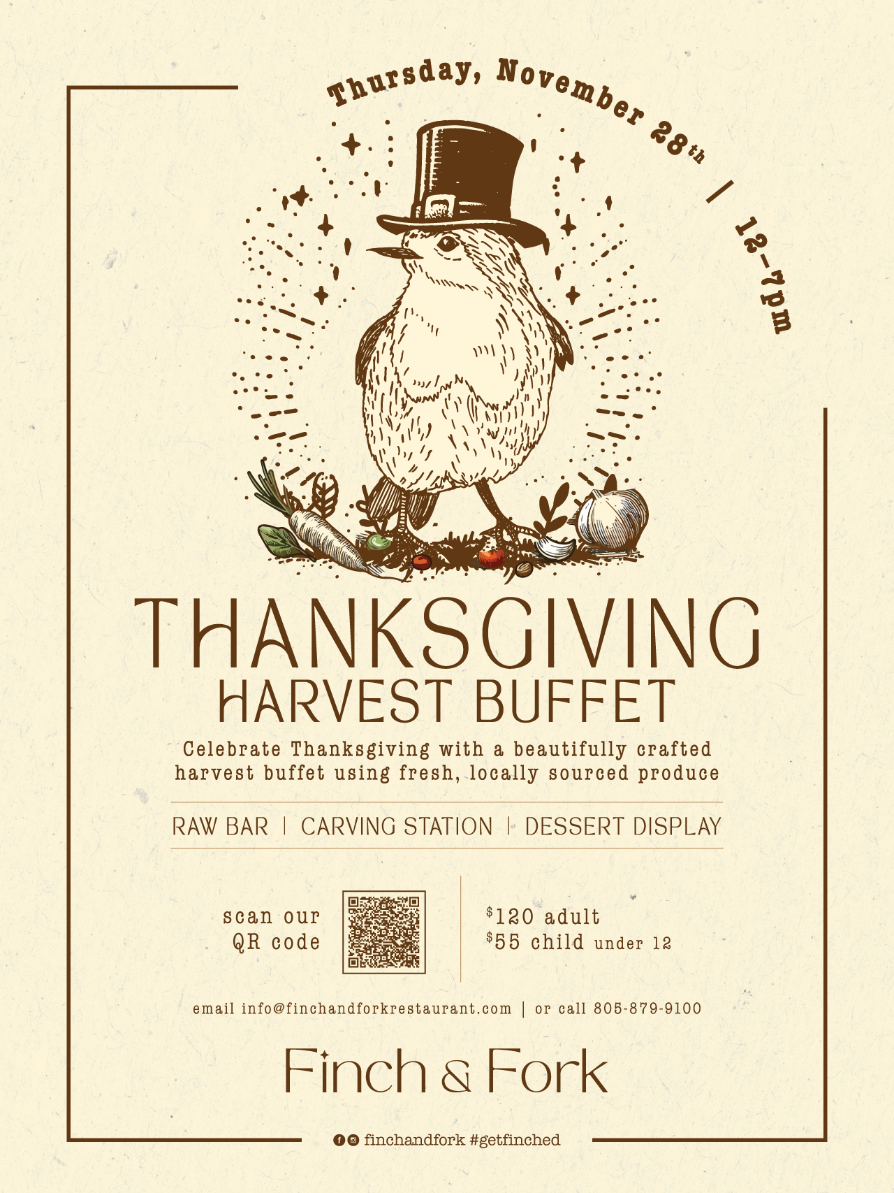 Gather your loved ones for an extraordinary Thanksgiving at Finch & Fork’s ‘Thanksgiving Harvest Buffet,’ on November 28th! Savor a beautifully crafted and curated harvest buffet, featuring local produce from the Santa Barbara region and local family farms. Indulge in a spectacular raw bar, carving stations, beloved classic sides and innovative new favorites, soups, salads, and a decadent dessert display. Raise a glass and give thanks with hand-crafted cocktails, local wines, and sparkling bubbles. Tickets are $120 for adults and $55 for children under 12 years old. Reserve a spot today and join Finch & Fork for a feast to remember!