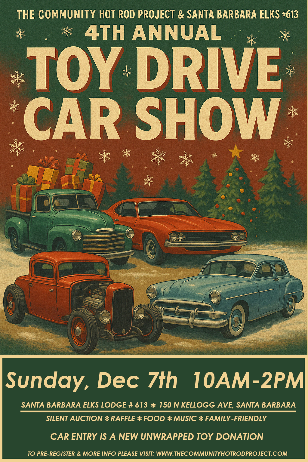 The Community Hot Rod Project’s 4th Annual Toy Drive Car Show will be 10 a.m.-2 p.m. Sunday, Dec. 7 at the Santa Barbara Elks Lodge #613, 150 N. Kellogg Ave.