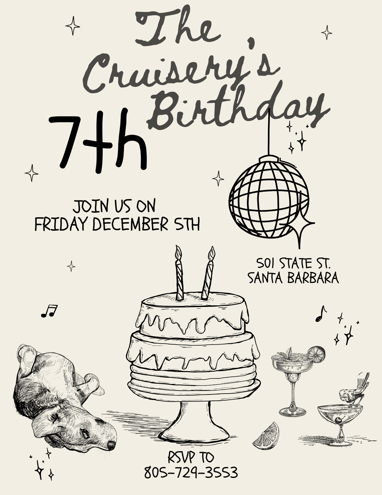 Join us at The Cruisery as we celebrate seven years of good food, great drinks, and even better company.