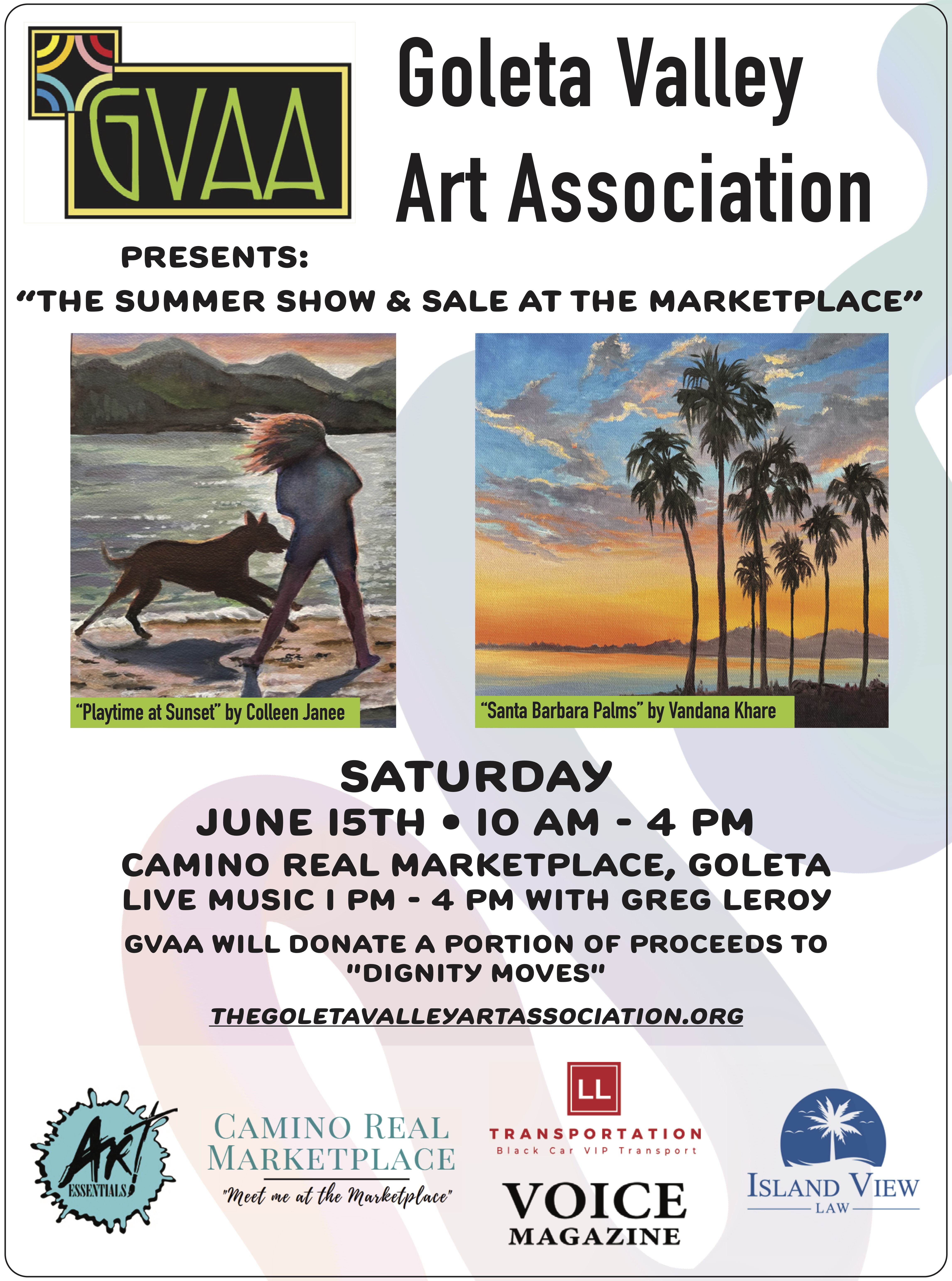 The Goleta Valley Art Association will mount its third annual Summer Show and Sale at the Marketplace, an art festival featuring original works by local artists on Saturday, June 15, from 10 a.m. to 4 p.m. at Camino Real Marketplace in Goleta. Sponsors include Art Essentials, Camino Real Marketplace, Limousine Link, Island View Law and The Voice Magazine.