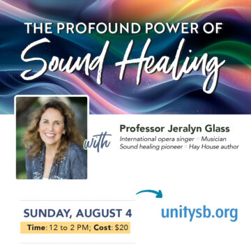 Jeralyn Glass will be appearing at Unity of Santa Barbara with her workshop, “The Profound Power of Sound Healing” on Sunday, August 4th at noon. The workshop includes discussion, Q & A, sound bath with crystal bowls, and book signing of Jeralyn’s new book, “Sacred Vibrations: The Transformative Power of Crystalline Sound & Music.”