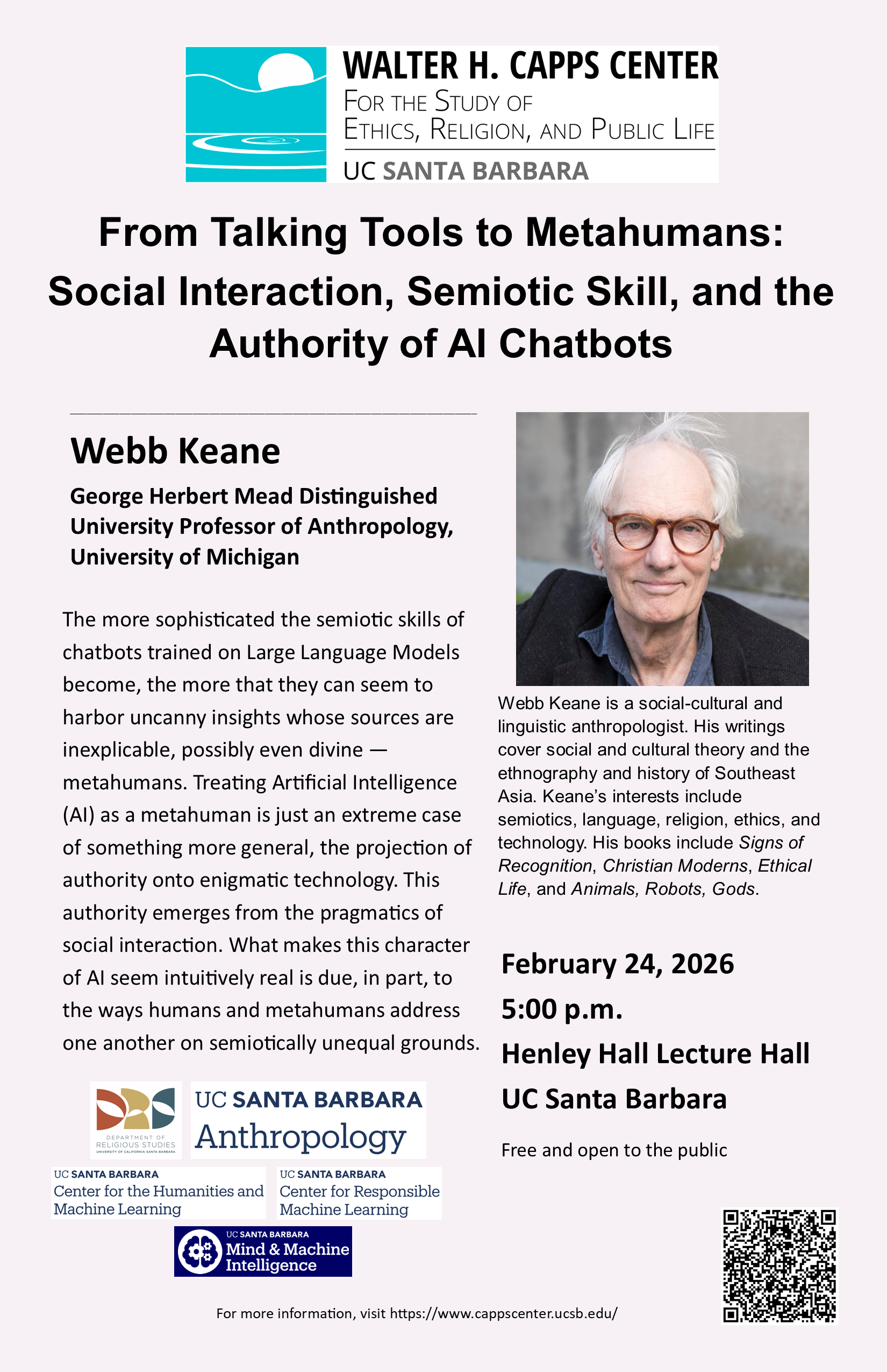 The Walter H. Capps Center for the Study of Ethics, Religion, and Public Life will present “From Talking Tools to Metahumans: Social Interaction, Semiotic Skill, and the Authority of AI Chatbots,” a lecture by Webb Keane, on February 24, 2026, at 5:00pm at UCSB’s Henley Hall Lecture Hall (1010). This event is free and open to the public.