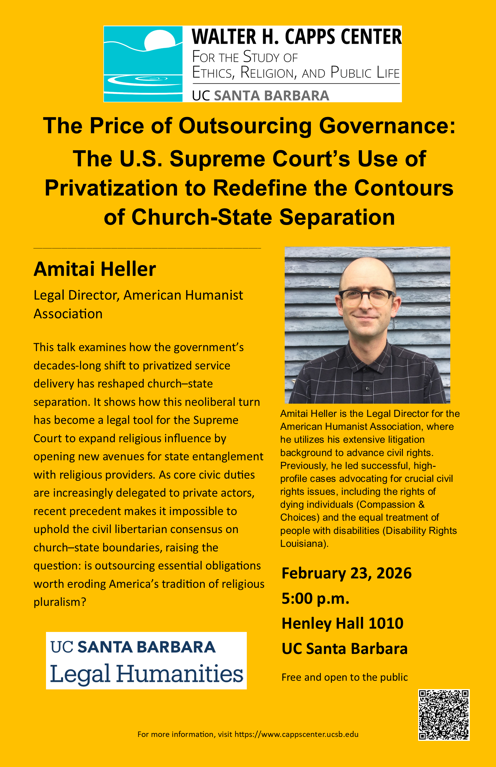 The Walter H. Capps Center for the Study of Ethics, Religion, and Public Life will present “The Price of Outsourcing Governance: The U.S. Supreme Court’s Use of Privatization to Redefine the Contours of Church-State Separation,” a lecture by Amitai Heller, on February 23, 2026, at 5:00pm at UCSB’s Henley Hall Lecture Hall (1010). This event is free and open to the public.