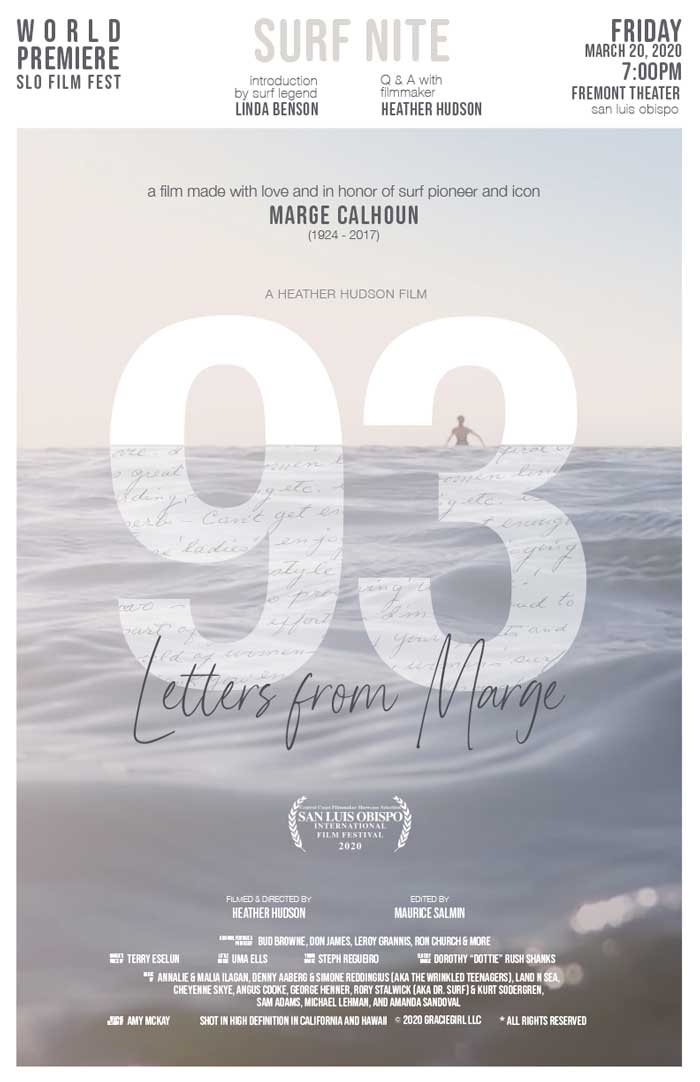 “Catch a wave for me!” “Love and Aloha” “Never Stop Lady!” are just some of the phrases that Marge Calhoun wrote down when she signed off in her many letters to a friend. Her friend happened to be surf documentary filmmaker, Heather Hudson. So when Marge Calhoun passed away in 2017 at the age of 93, the Santa Barbara based filmmaker was inspired to create a film in her honor and to tell her stories in Marge’s own words from the handwritten letters.