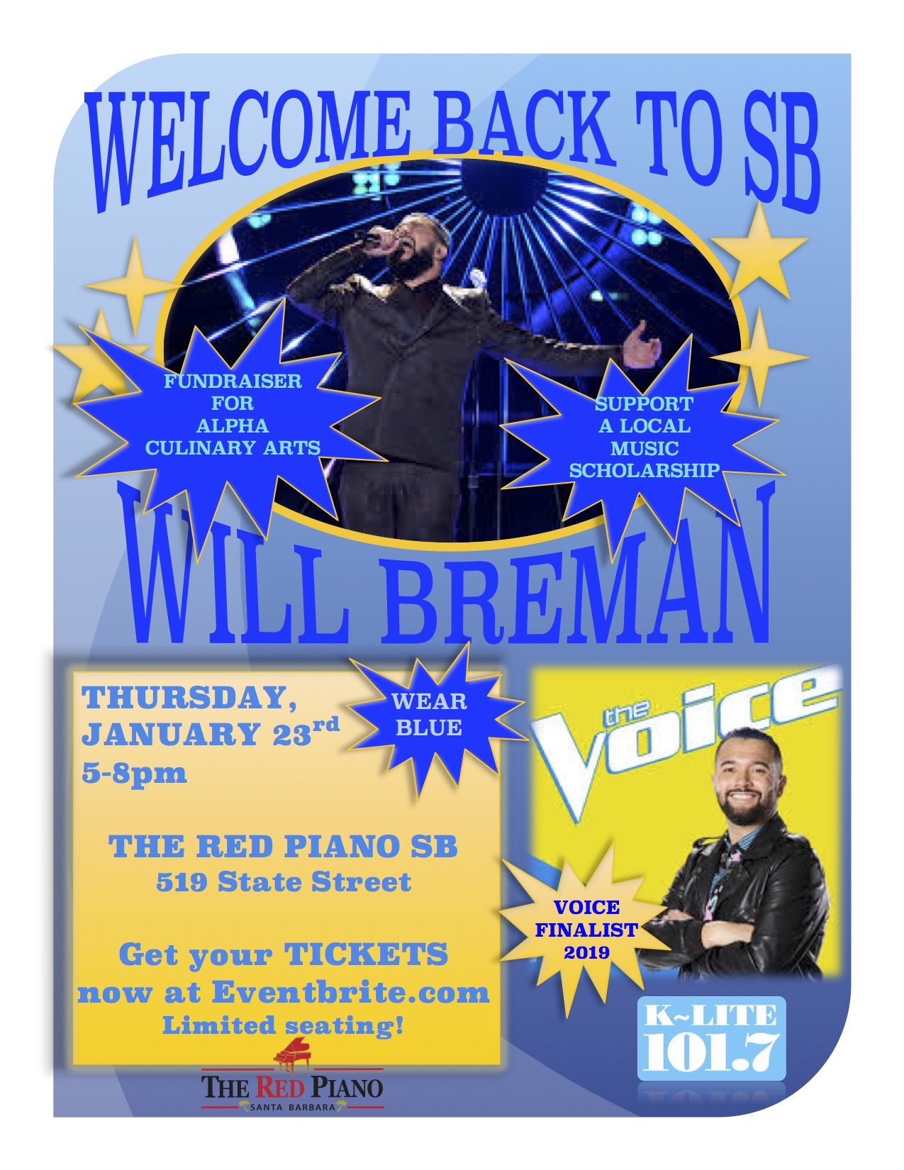 After finishing Top 8 in the most recent “The Voice” competition Will has come home to Santa Barbara to a heroes welcome. We are excited that he’s coming to play The Red Piano, and for such a great cause. All ticket sales go to Alpha Resource Center Culinary Arts and The Red Piano/Marcie Kjoller Music Scholarship. Wear blue to support Will and his #BLUECREW!