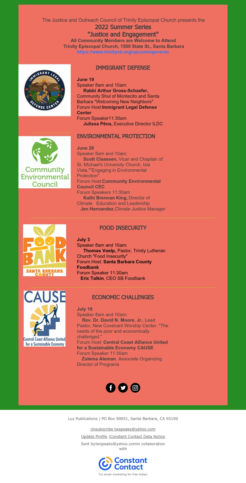 Join the conversation with community advocates, concerned residents, and local service providers. Sunday, June 19 and June 26, Sunday, July 3 and July 10, 2022. Be encouraged with value driven messages at the 8 am and 10am services. Share practical and effective local actions at an 11:30 am forum. The setting is casual and congenial, light refreshments will be provided. All sessions take place at Trinity Episcopal Church 1500 State St., Santa Barbara https://www.trinitysb.org/upcomingevents Zoom link available on website