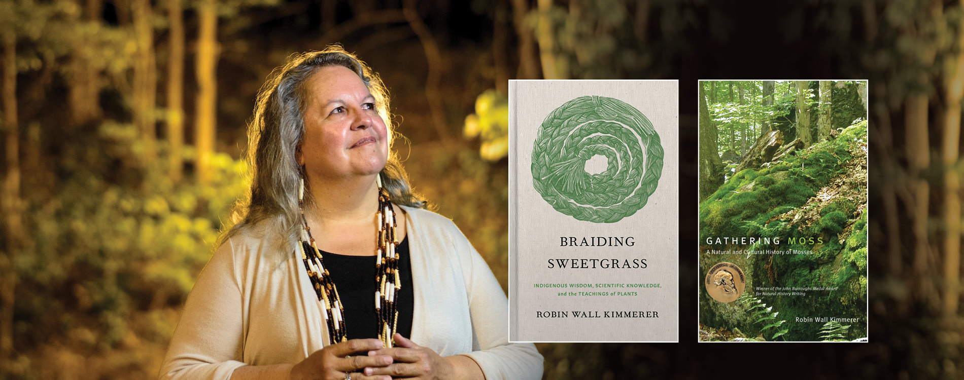 Robin Wall Kimmerer is a plant ecologist, 2022 MacArthur fellow and member of the Citizen Potawatomi Nation. She is the acclaimed author of Braiding Sweetgrass, which celebrates the reciprocal relationship between humans and nature and embraces the notion that plants and animals are our oldest teachers. Articulating a vision of environmental stewardship grounded in scientific and Indigenous knowledge, Kimmerer was elected to the National Academy of Sciences in 2023.