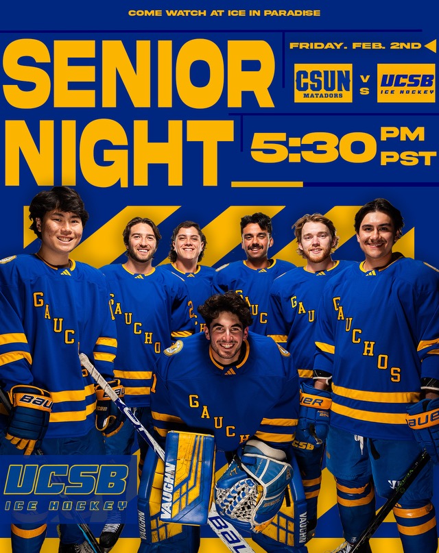 UCSB Ice Hockey will be celebrating its Senior Night this Friday, February 2 2024 at 5:30 p.m at the Ice in Paradise, hosting the rival Cal State Northridge Matadors.