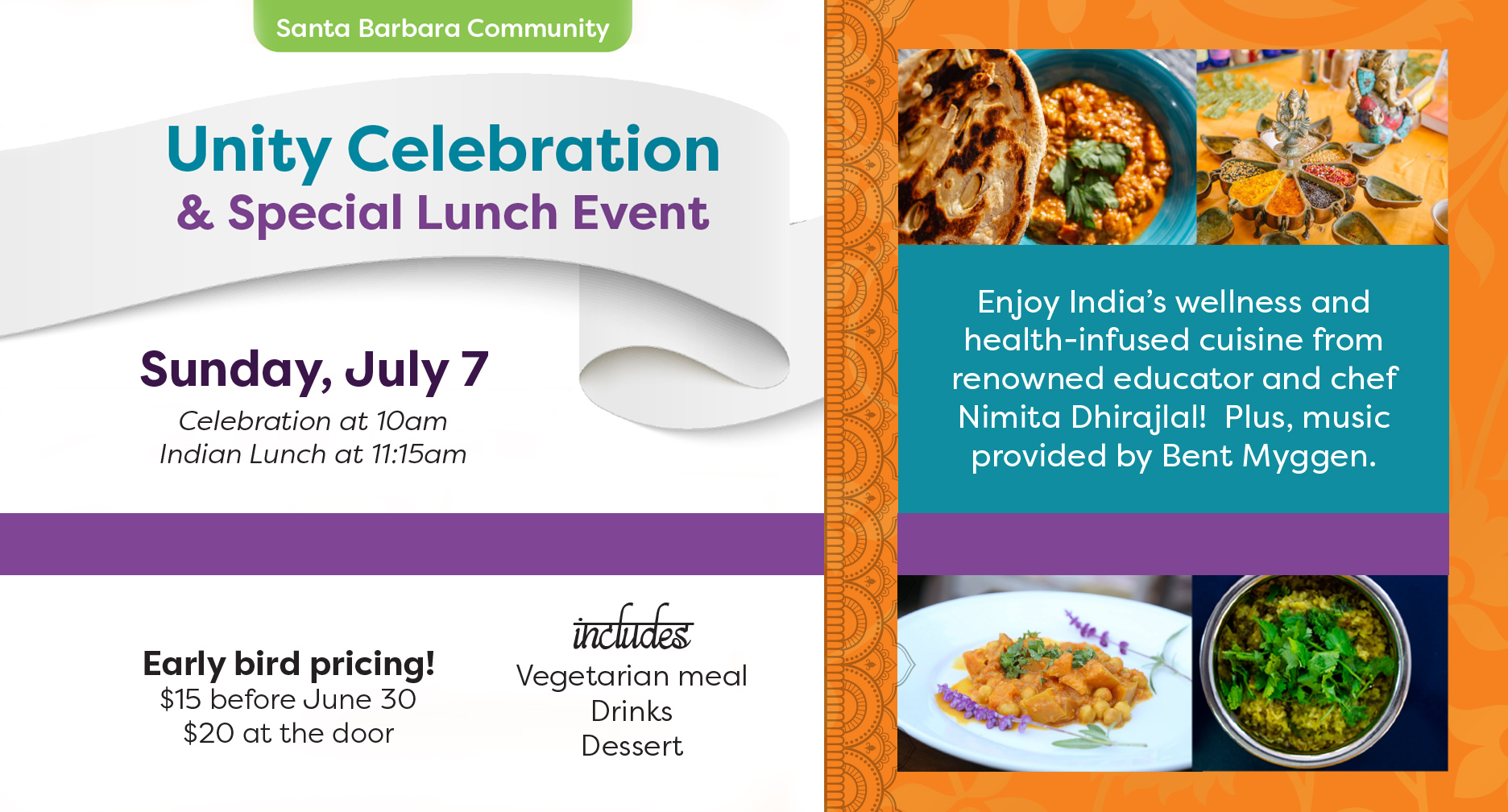 Submit Event Unity Community Lunch with Nimita Share this: Click to share on Facebook (Opens in new window) Facebook Click to share on X (Opens in new window) X Click to email a link to a friend (Opens in new window) Email Click to print (Opens in new window) Print Best Bet Community Food Unity of Santa Barbara Add independent.com on Google Add the SB Independent as your preferred source to see more of our stories on Google. Contact Details: Phone: (805) 966-2239 Website: View Website Social Media: Add to Calendar Get Tickets - 15 **Events may have been canceled or postponed. Please contact the venue to confirm the event. Date & Time Sun, Jul 07 11:00 AM - 1:00 PM Address (map) 227 E. Arrellaga St. Venue (website) Unity of Santa Barbara Nimita returns to Unity of Santa Barbara with a scrumptious buffet for our community lunch after service on July 7th. Music also provided by Bent Myggen. Early bird pricing – $15 until June 30th, $20 after. Click here to reserve your lunch today! Previous Event Next Event
