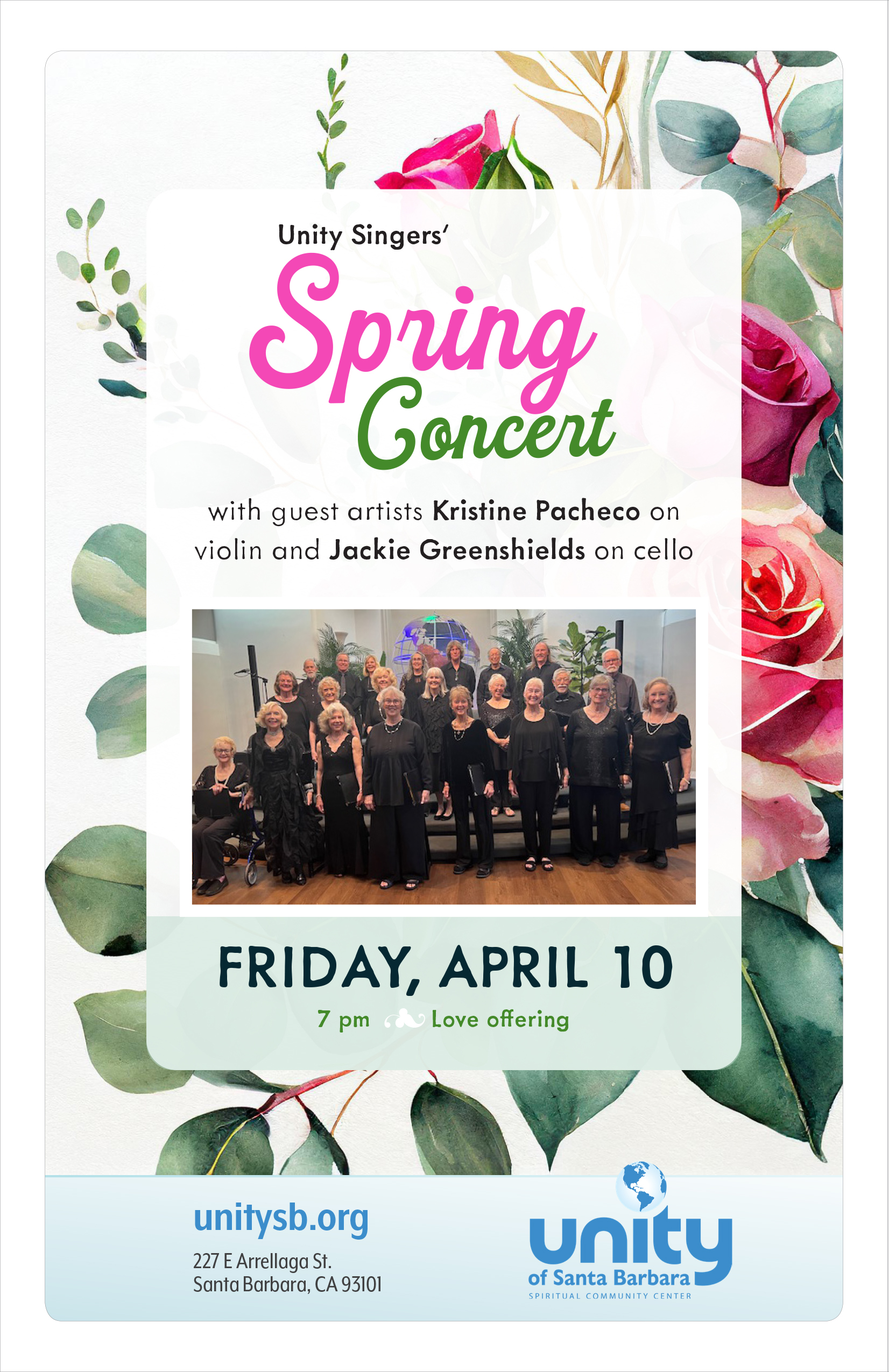 The Unity Singers present their spring concert of beautiful songs that will sooth your soul. They are joined by guest artists Jacqueline Greenshields on cello and Kristine Pacheco on violin.