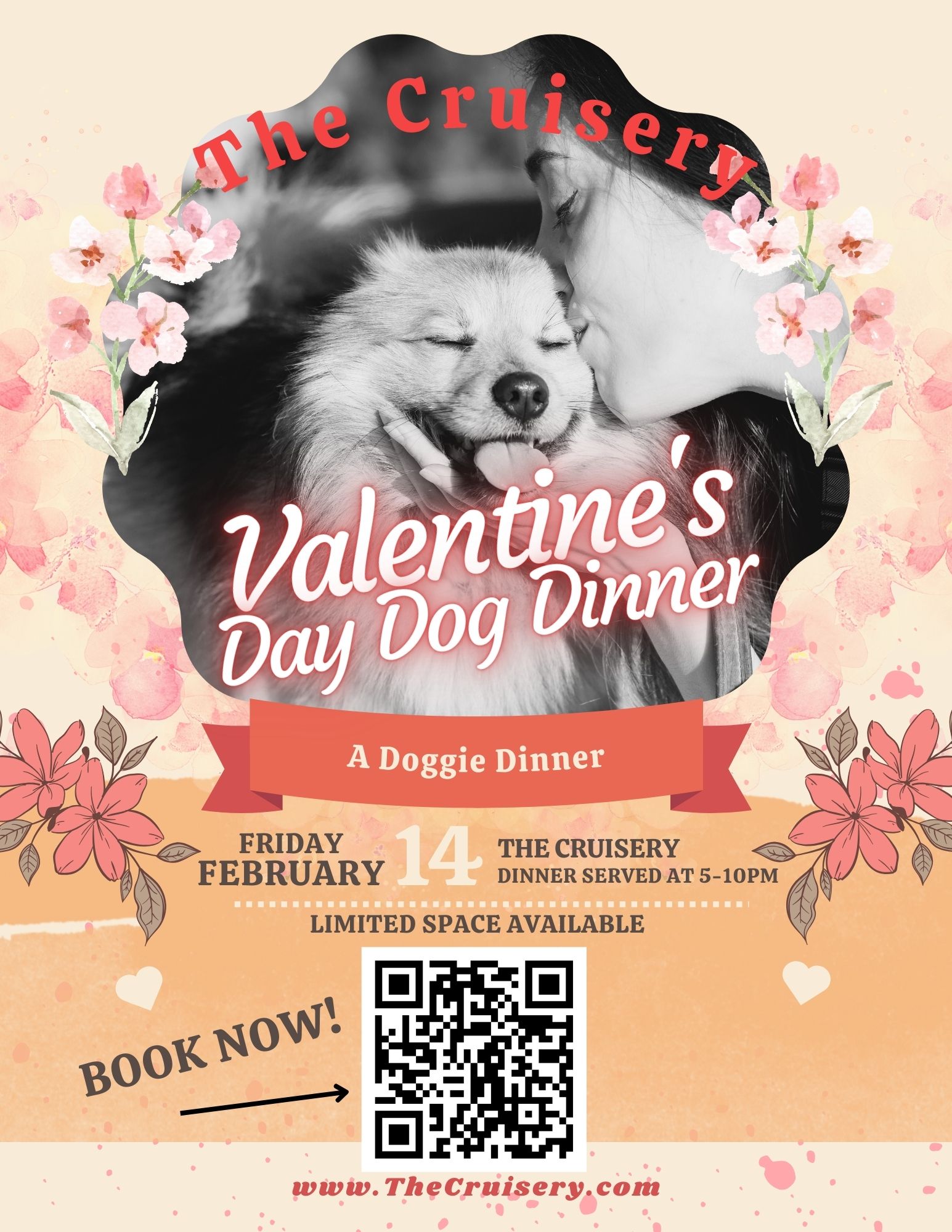 Looking for the ultimate way to spend Valentine’s Day with your true soulmate—your dog? Join us at The Cruisery on Friday, February 14th, from 5 PM to 10 PM, for a one-of-a-kind Valentine’s Day Dog Dinner that celebrates the love between you and your four-legged best friend!