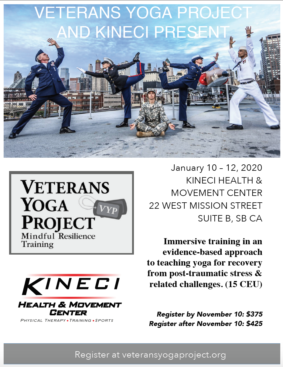 Mindful Resilience is what we call the collection of mind-body practices that we teach: Breathing, Meditation, Mindful Movement, Guided Rest, and Gratitude. These tools help us breathe easy, focus clearly, move freely, rest deeply, and remember what is working in our lives. As a result we become more resilient in the face of both ordinary and extraordinary challenges. Veterans Yoga Project is teaming up with the Kineci Health & Movement Center to offer an extraordinary opportunity for intensive training in a proven, mindful approach to teaching yoga to veterans and others who are struggling with post-traumatic stress and other trauma-related psychological difficulties.