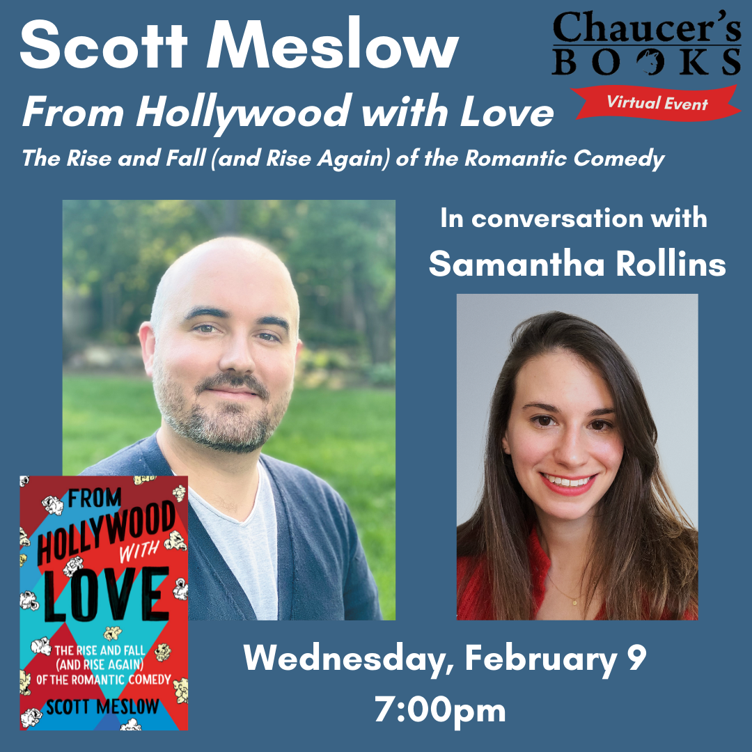 In a pre-Valentine’s Day celebration, Chaucer’s Books will host journalist Scott Meslow as he talks about his book FROM HOLLYWOOD WITH LOVE: THE RISE AND FALL (AND RISE AGAIN) OF THE ROMANTIC COMEDY with entertainment editor Samantha Rollins on Zoom and YouTube on Wednesday, February 9 at 7 p.m.